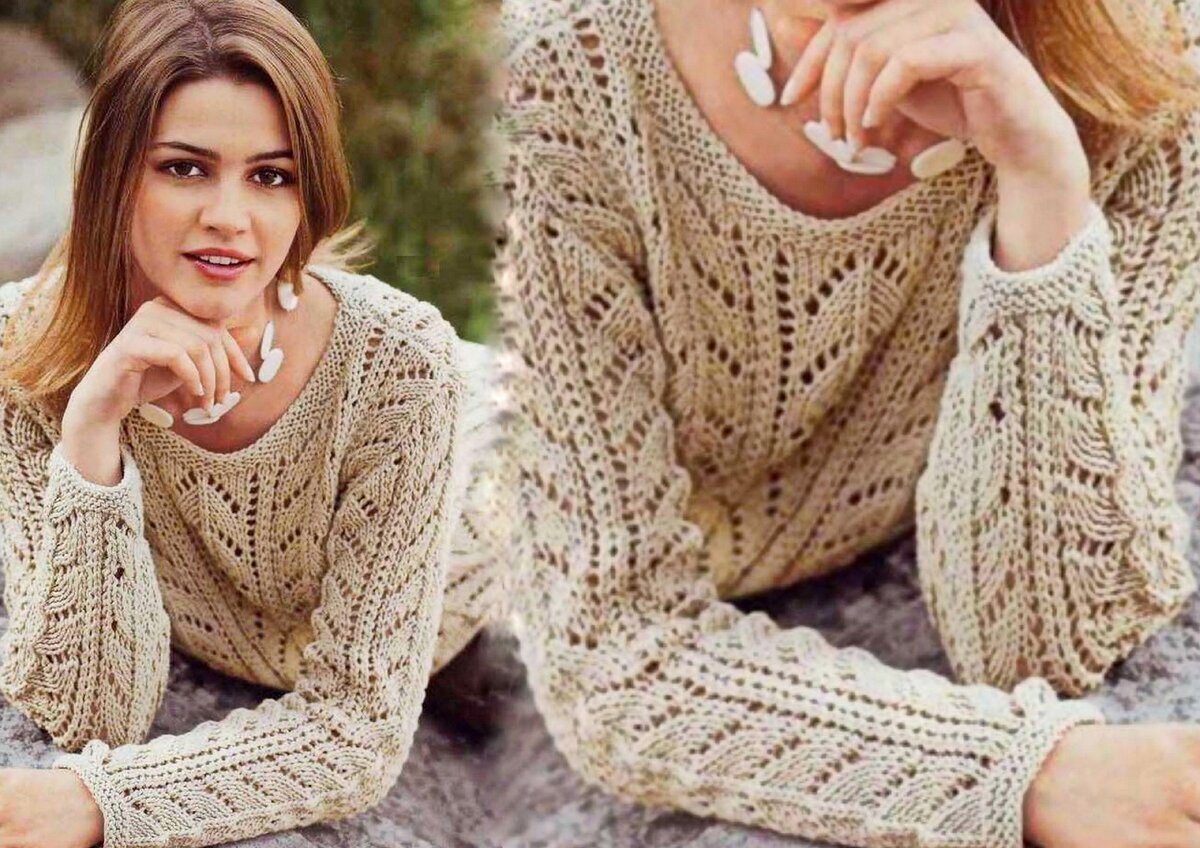 Стильный бежевый джемпер — интересное сочетание ажурных узоров и платочной вязки, которой отделан низ, горловина и манжеты.