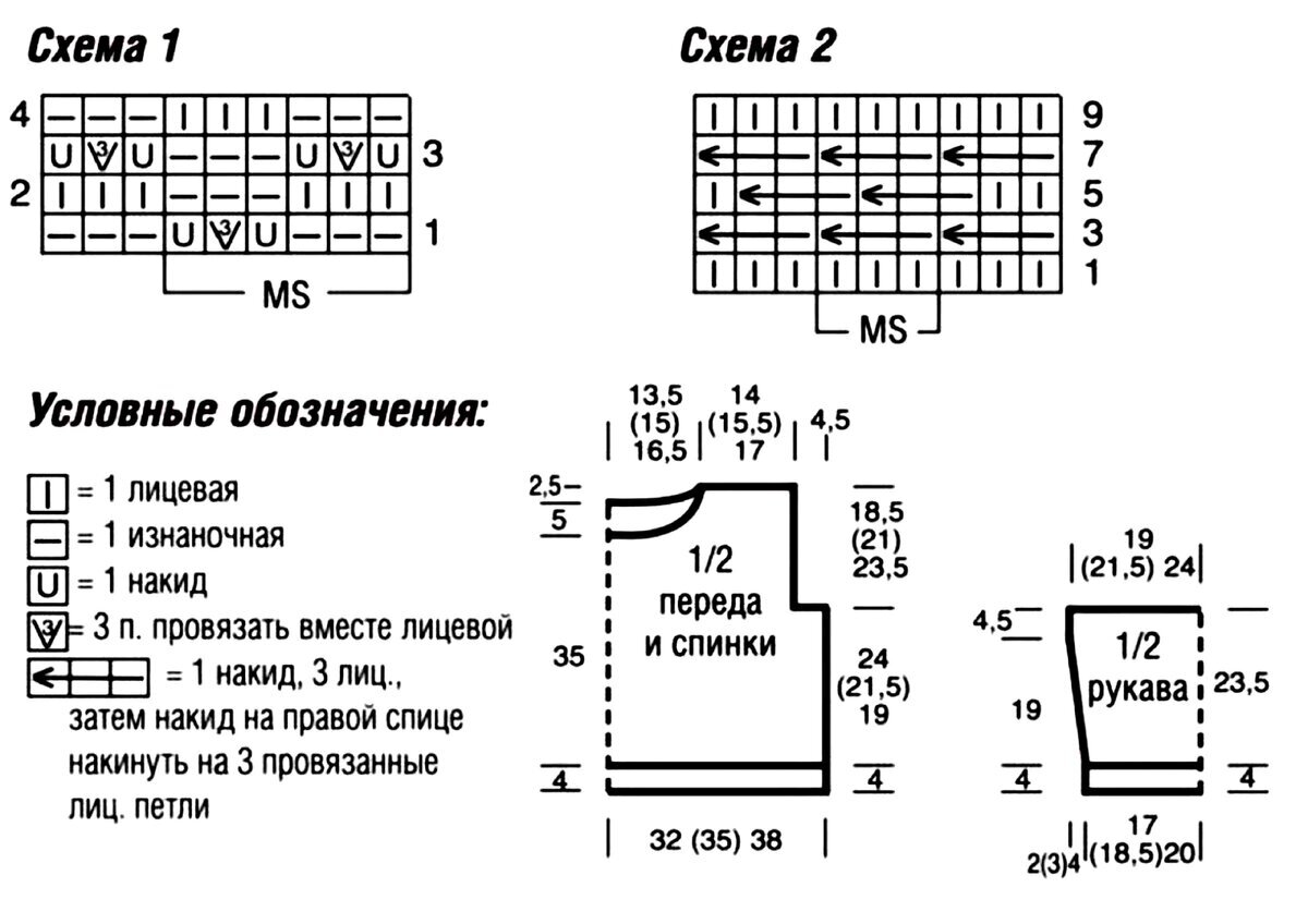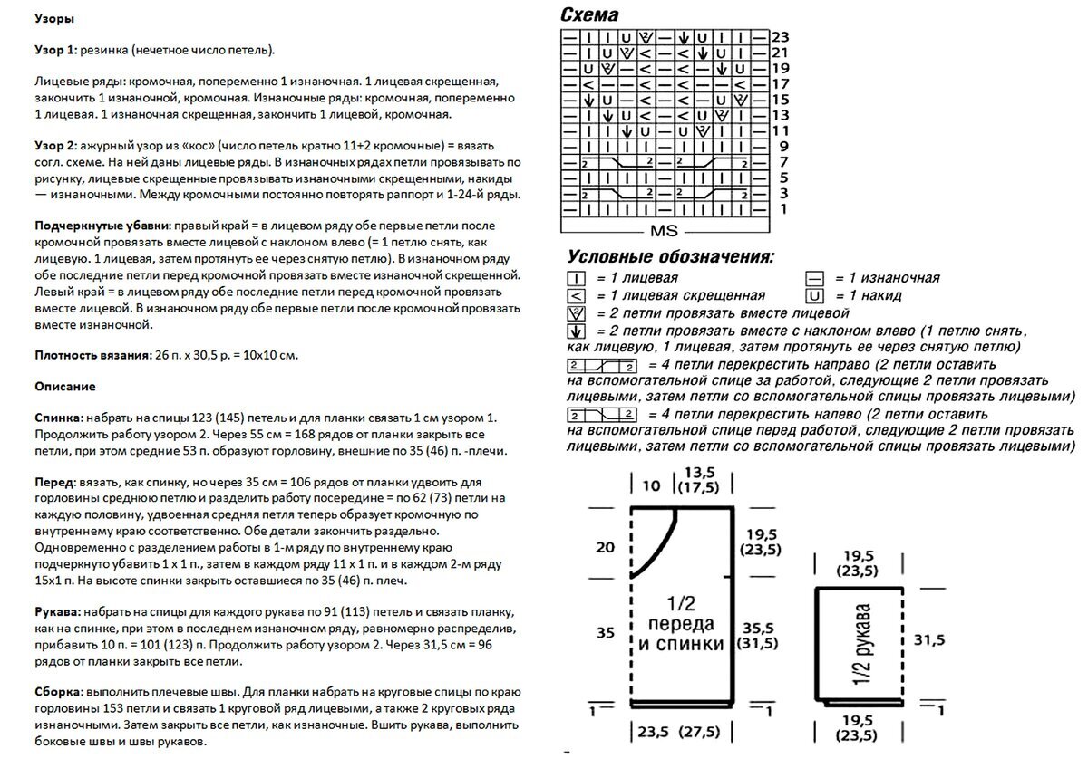 Для вязания этой модели свободного кроя нам понадобится 500 (550) 600 гр — на размеры 38/0 (42/44) 46/48 соответственно —лилово-розовой пряжи: 100% хлопок; 50 гр — 125 м. Спицы № 3,5 и № 4,5, а также круговые спицы № 3,5.