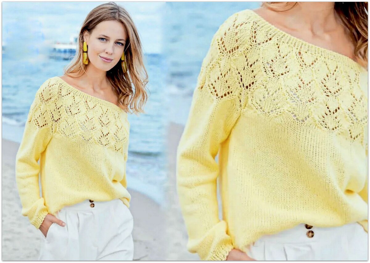 По-настоящему свежий весенний джемпер лимонного цвета с красивой ажурной кокеткой.