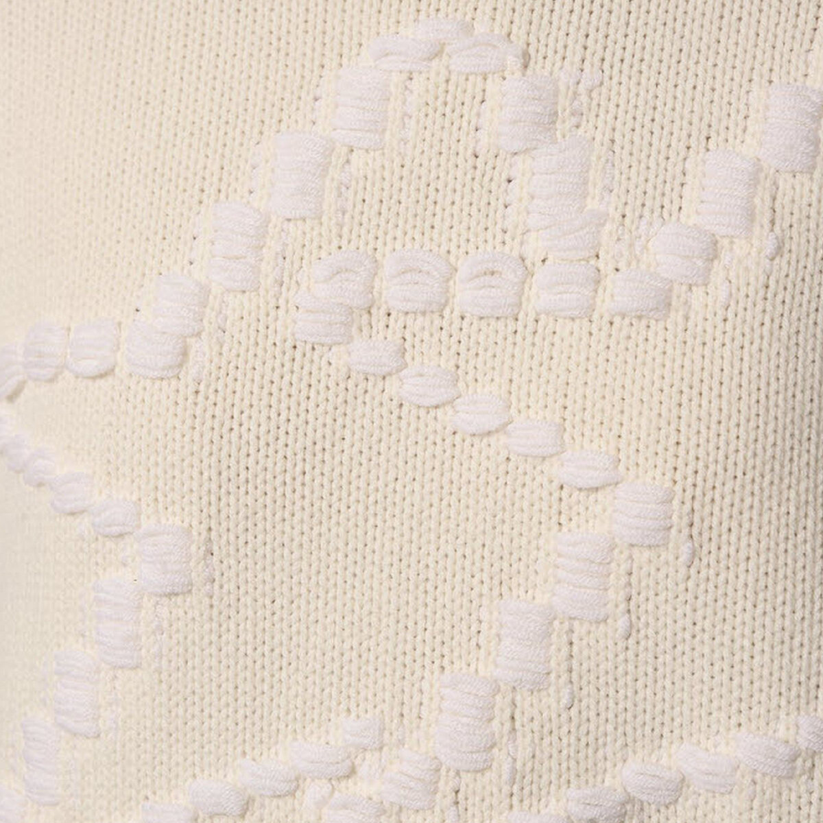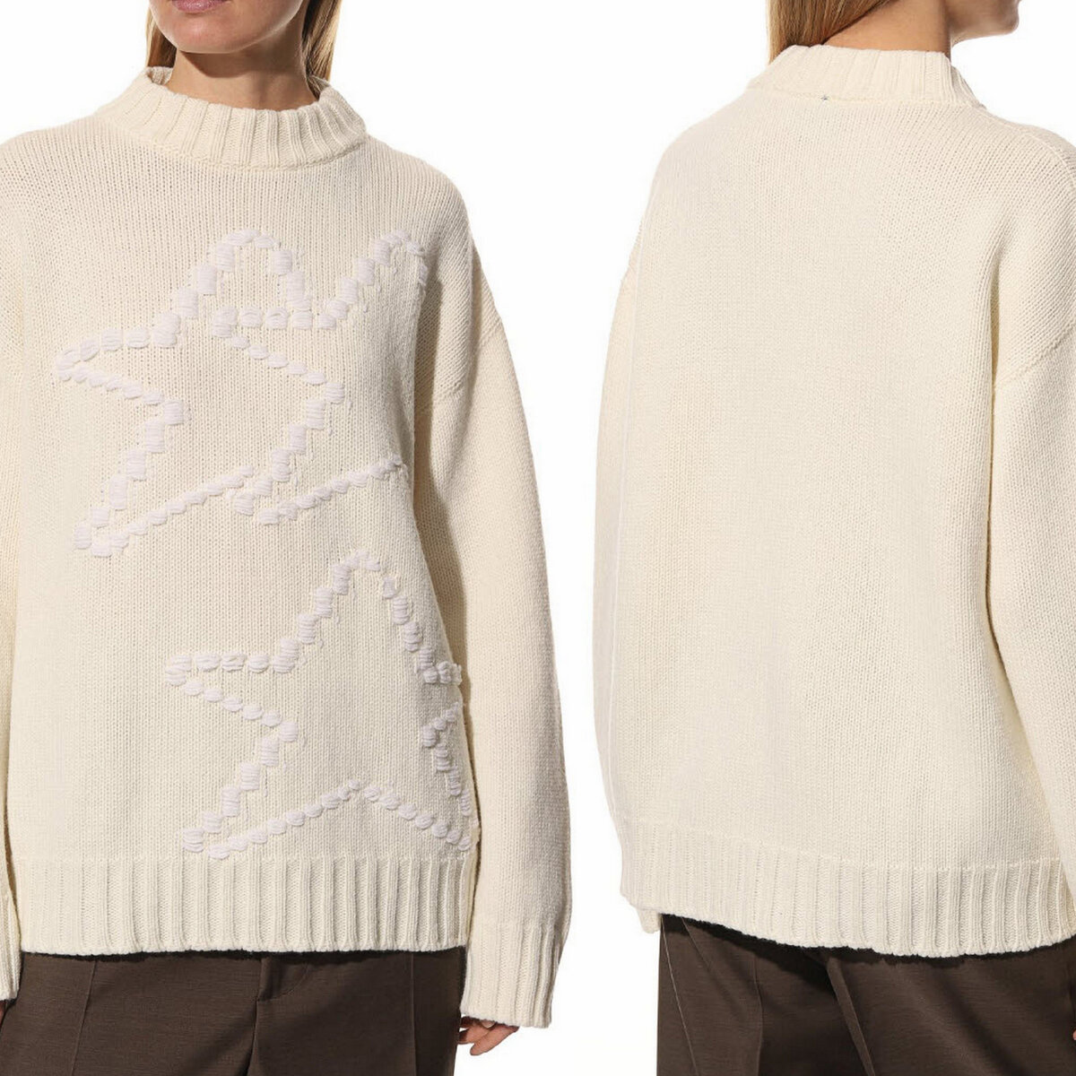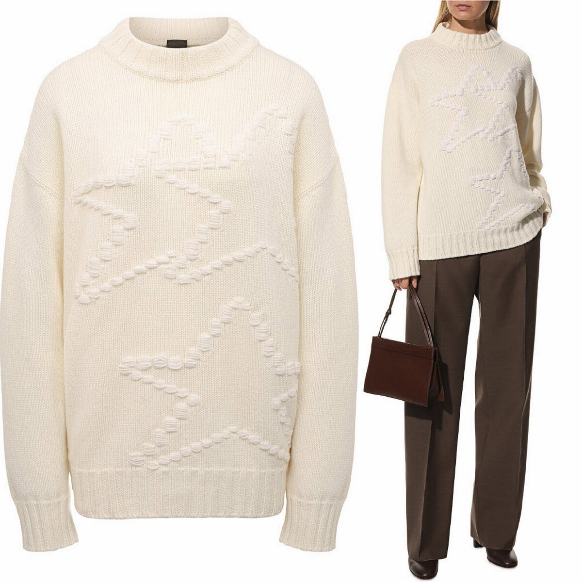 Кремовый свитер от популярного итальянского бренда. В целом очень простая модель — обычная лицевая гладь, прямой фасон, спущенный рукав. Такой свитер можно за сутки связать на вязальной машинке, если она у вас есть. А рисунок вышить протяжками с помощью иглы. Кстати, рисунок таким образом можно сделать совершенно любой — на что хватит вашего умения и терпения.