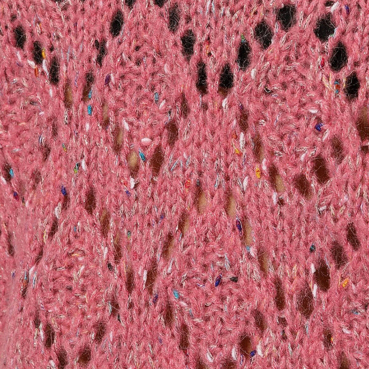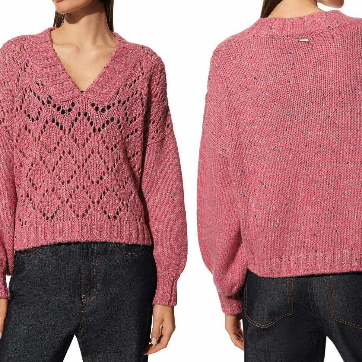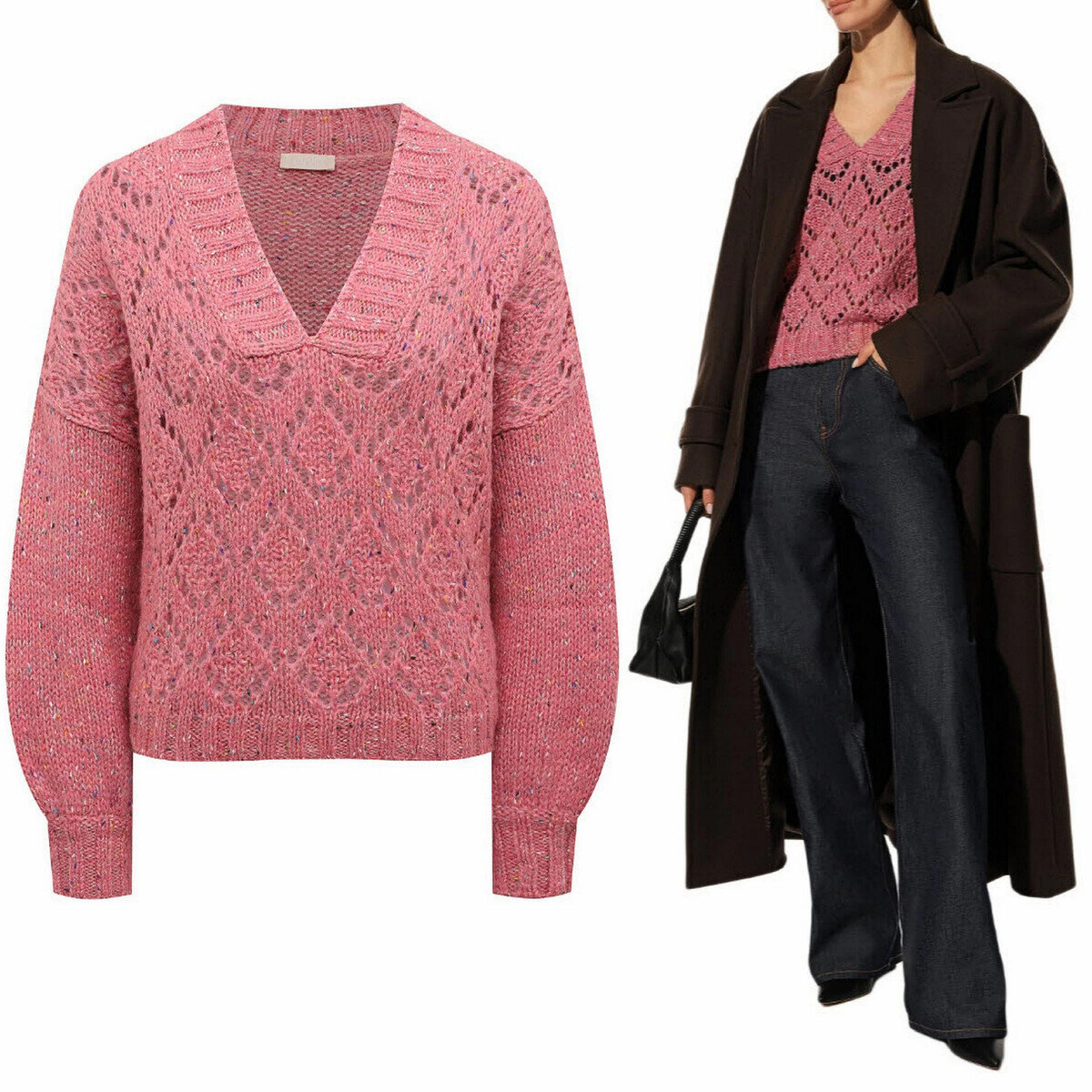 Ажурный пуловер пастельно-розового цвета от итальянского бренда. Простая модель свободного кроя с оригинальным V-образным вырезом, широкими спущенными рукавами и узором из крупных ажурных ромбов. Мягкая ниточка с эффектом твида.