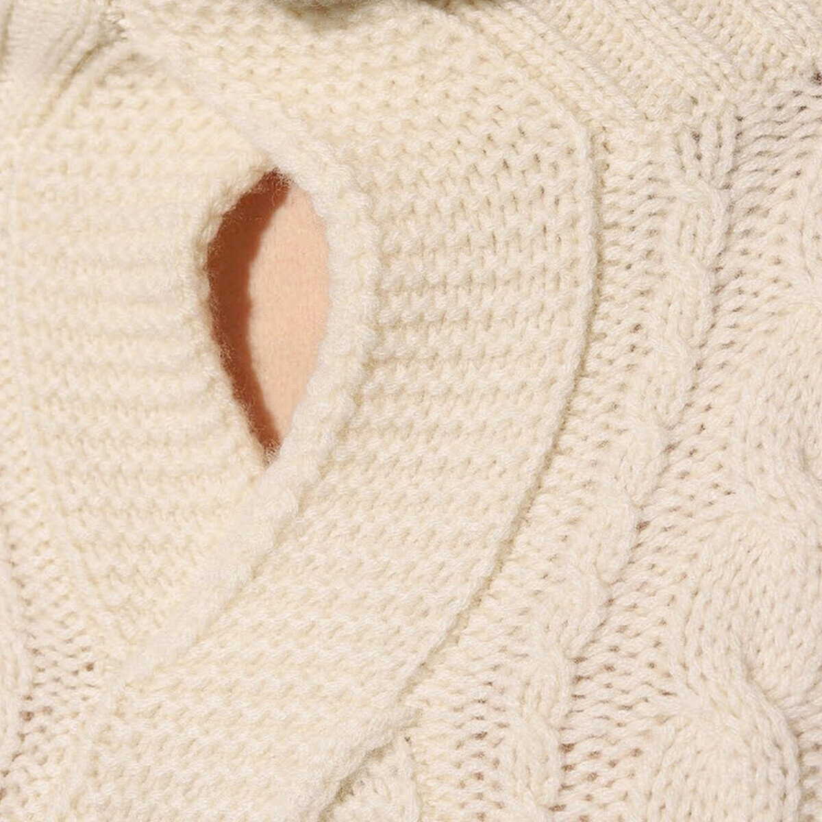 Мне нравятся эти косы-змейки. Скорее всего они вяжутся как две отдельные полосы и только потом перекрещиваются — это заметно по фото, где свитер уже на модели.